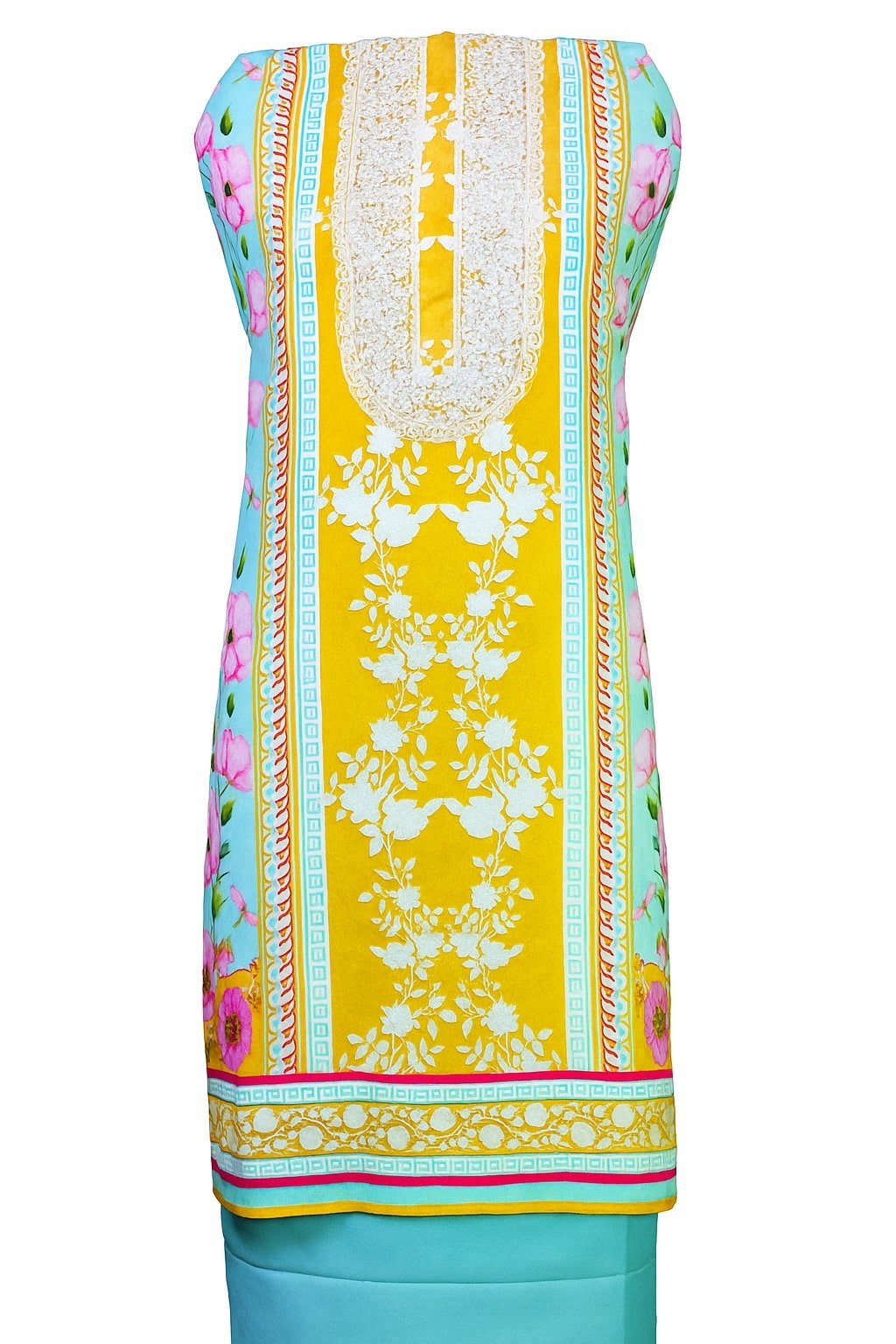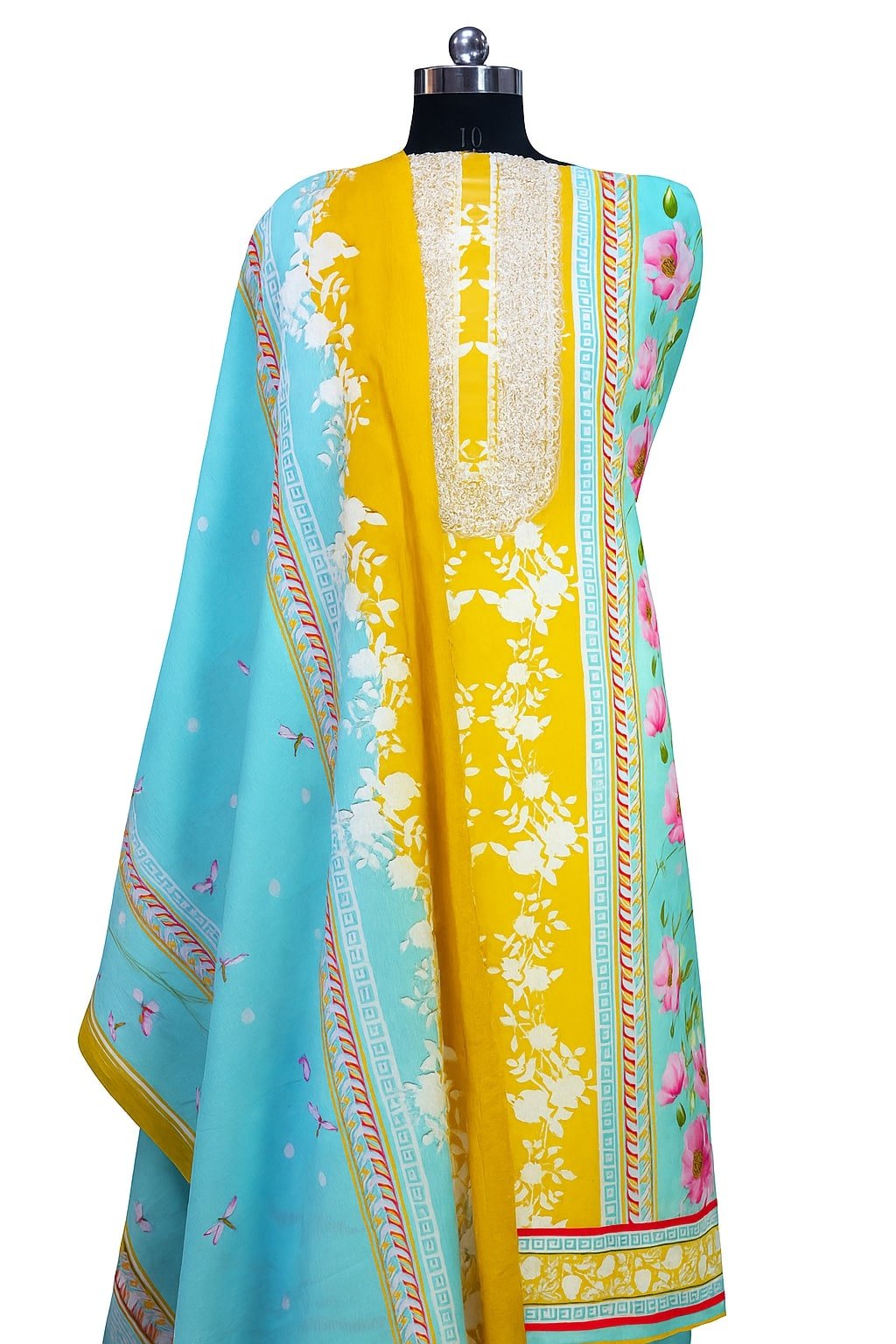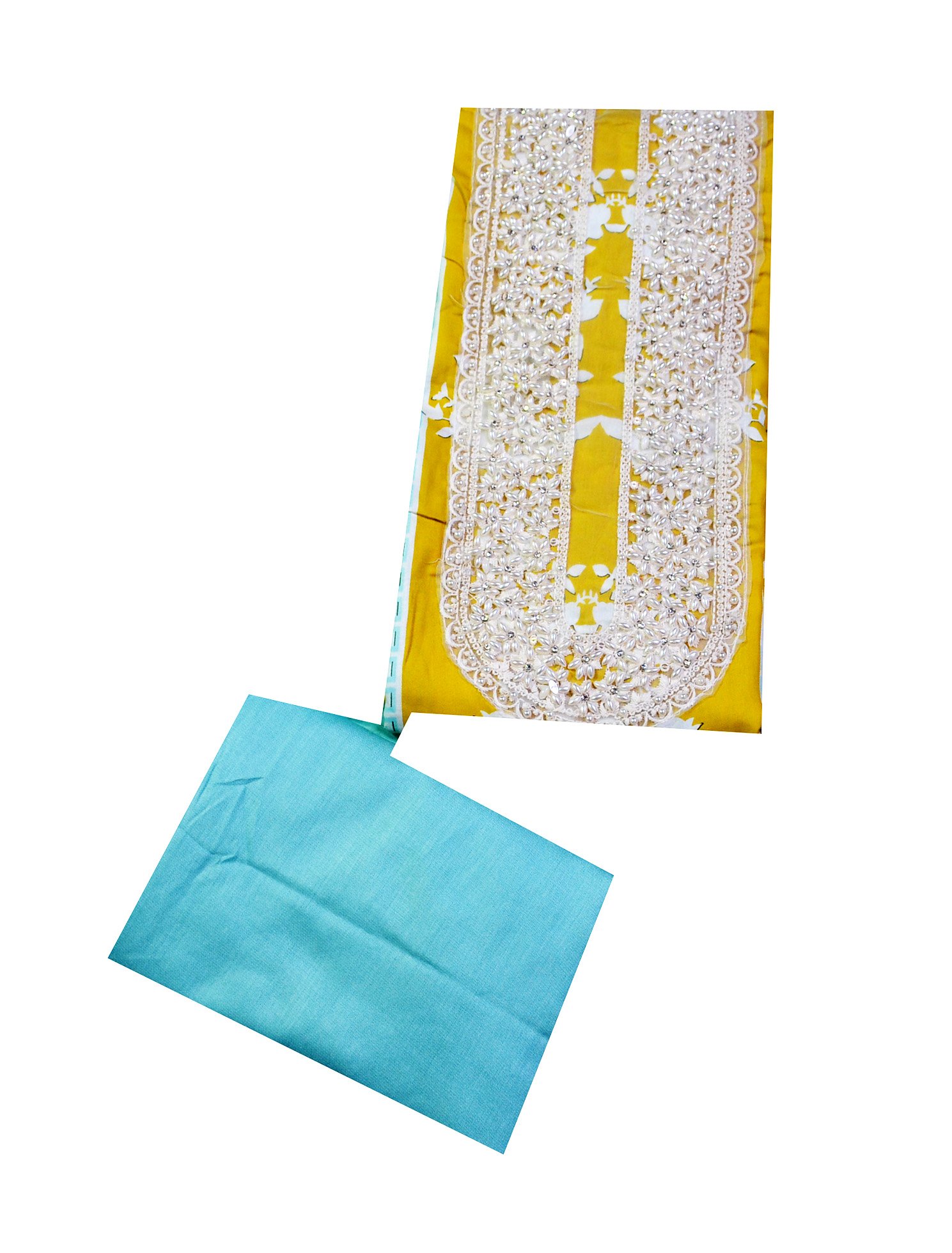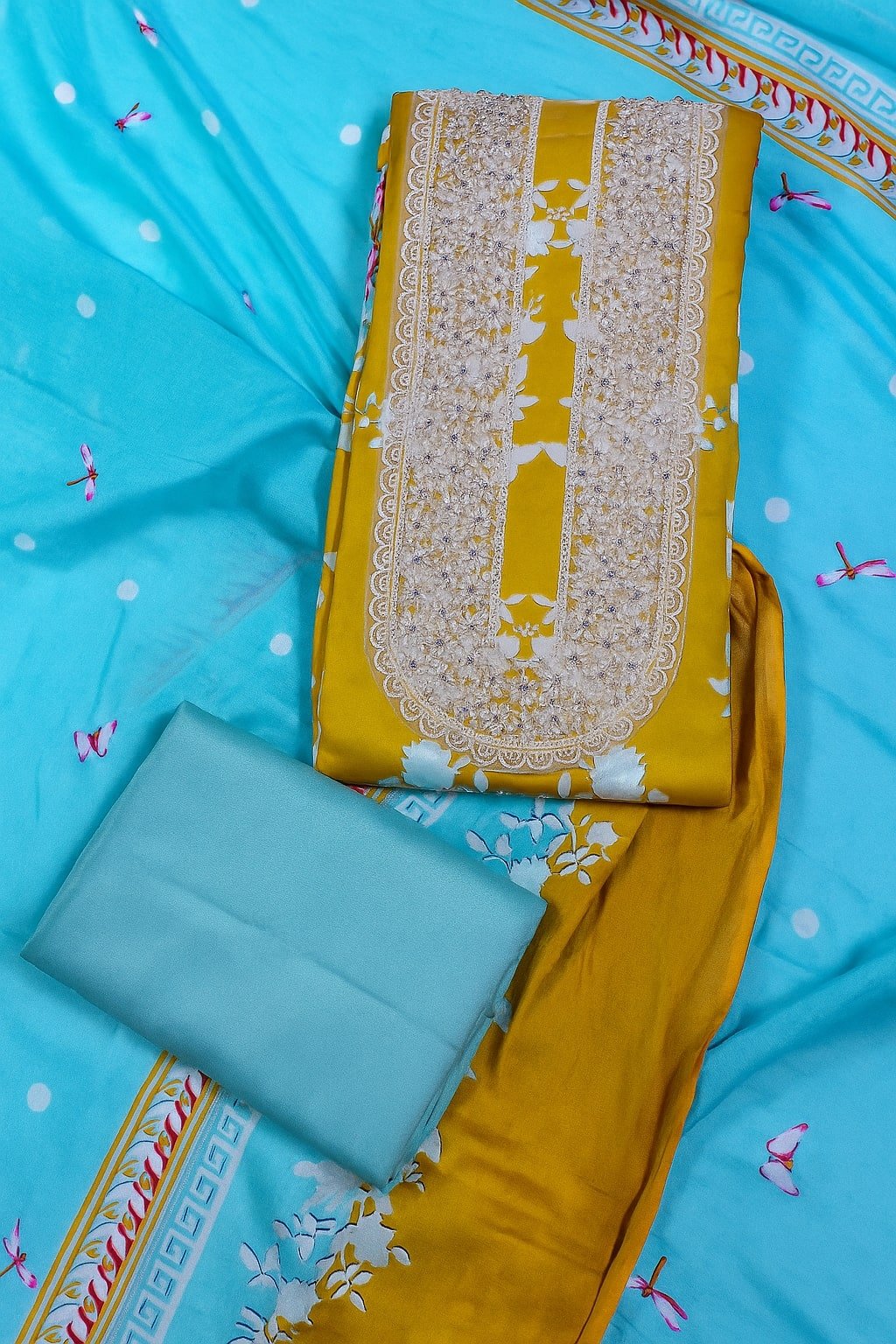 Add a pop of color and sophistication to your ethnic collection with this mustard yellow and sky blue suit set. The kurta features intricate embroidery on the front panel, giving it a graceful and festive appeal. It is paired with a plain mustard bottom and a sky blue printed dupatta adorned with floral and decorative motifs, making this ensemble perfect for festive celebrations, casual gatherings, and traditional events. Crafted from premium soft fabric, this outfit ensures comfort along with a stylish edge.