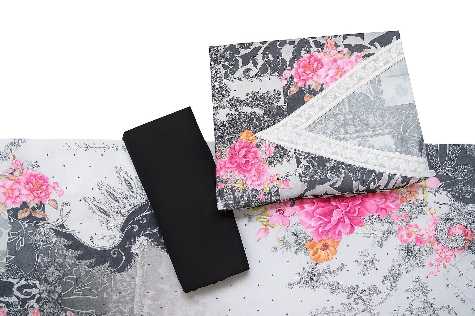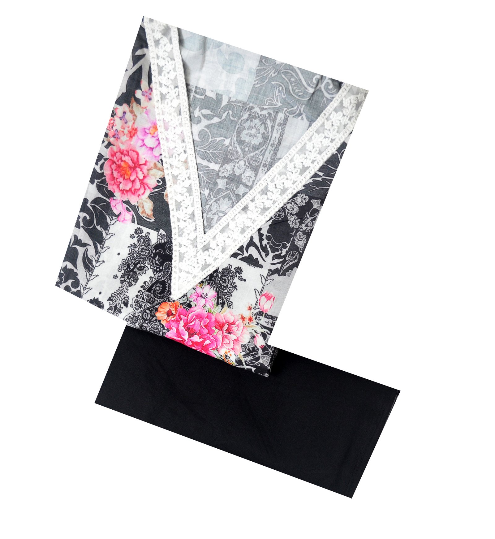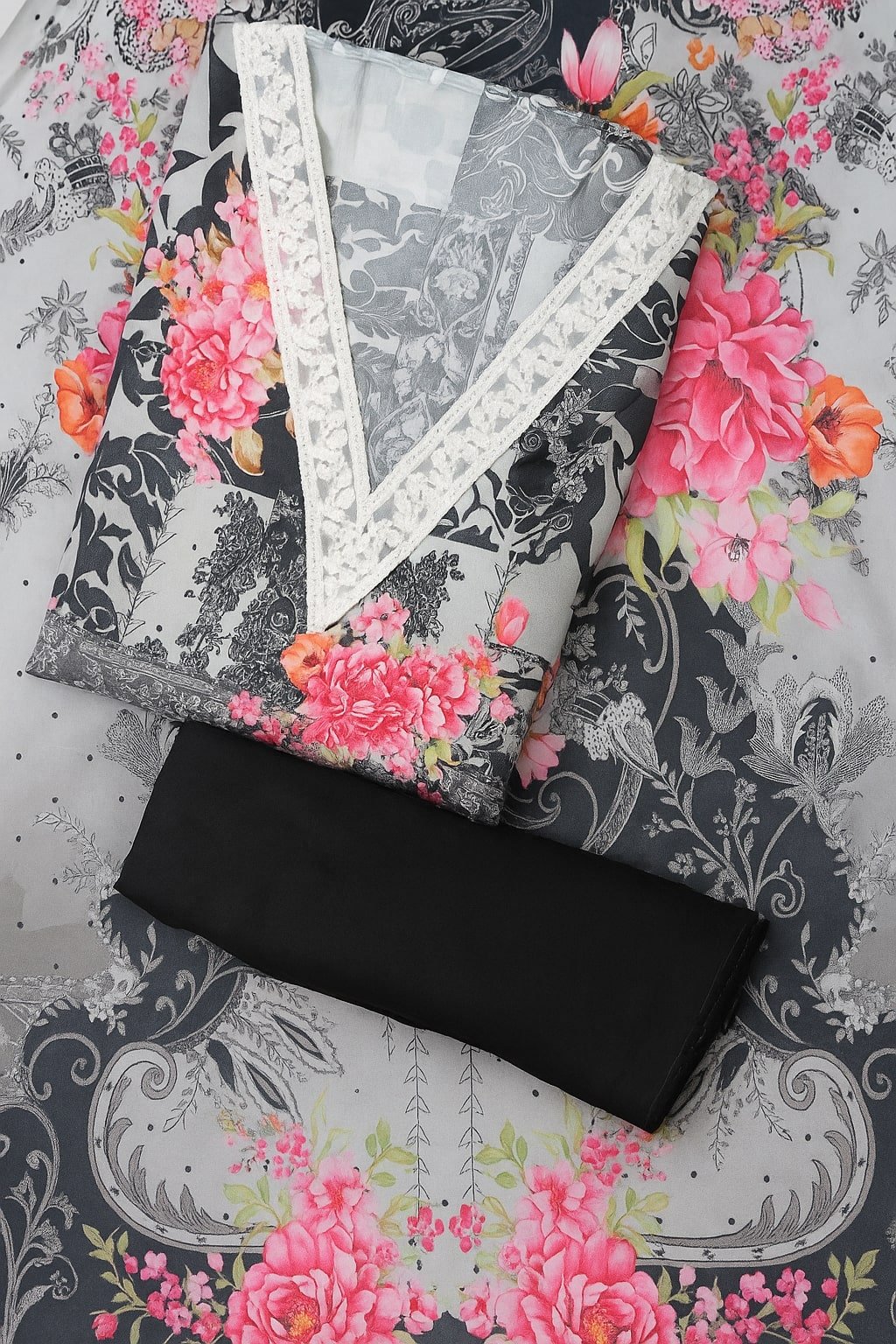 Add a touch of sophistication to your ethnic wardrobe with this grey and black floral printed suit set, adorned with vibrant pink and orange flowers for a striking contrast. The white lace detailing along the V-neckline gives this outfit a refined, feminine appeal. Crafted from premium quality fabric, this suit set ensures both comfort and elegance for all-day wear. It includes a beautifully printed dupatta and a solid black bottom fabric, making it an ideal choice for festive occasions, parties, and traditional gatherings. Style it with statement jewelry for a complete look.