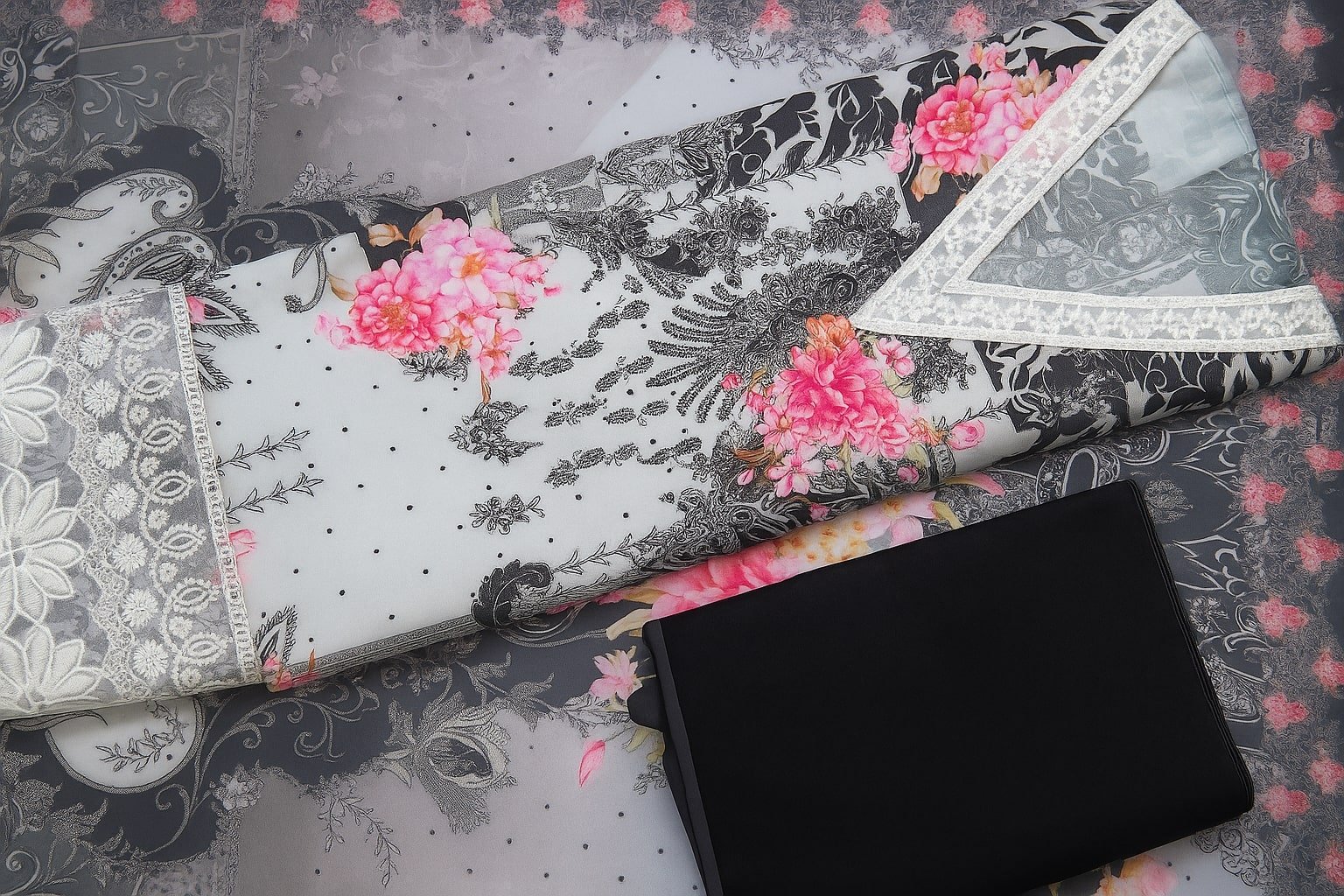 A stunning grey and black floral printed suit set featuring delicate white lace detailing on the neckline, paired with a matching dupatta and solid black bottom. Perfect for festive and party wear.