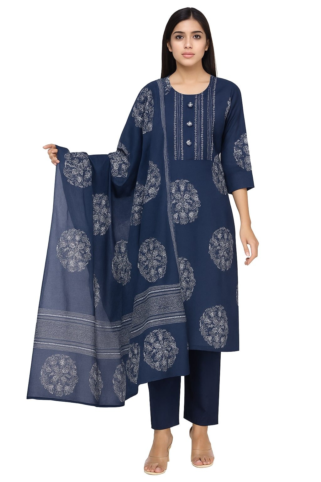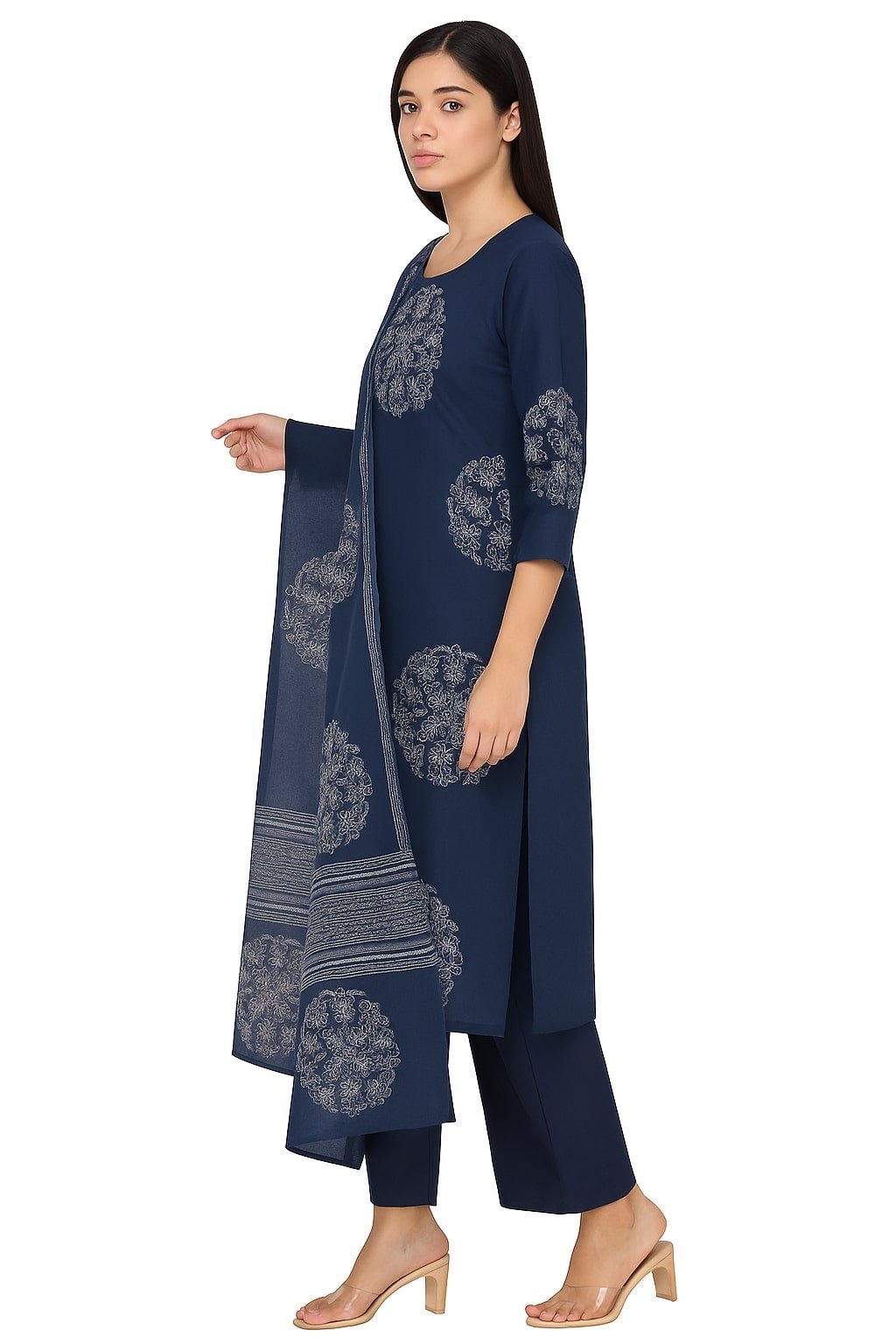 Upgrade your ethnic wardrobe with this stunning navy blue unstitched suit set. Designed with delicate embroidery on the kurta, a solid matching bottom, and a beautifully crafted dupatta, this suit strikes the perfect balance of style and comfort. Ideal for festive celebrations, family gatherings, office wear, or casual outings, this suit set allows you to get it stitched in your preferred style. Made with soft and breathable fabric, it ensures all-day comfort while giving you a graceful traditional look.