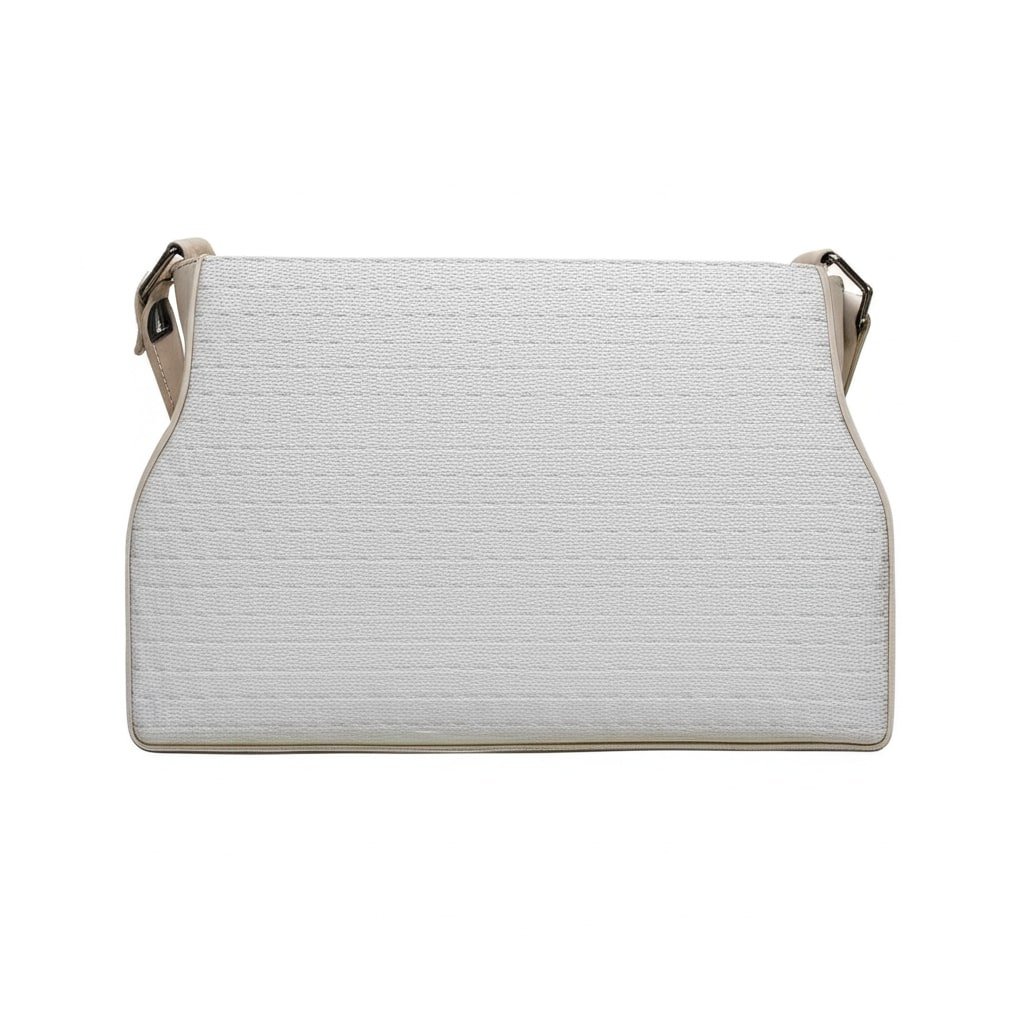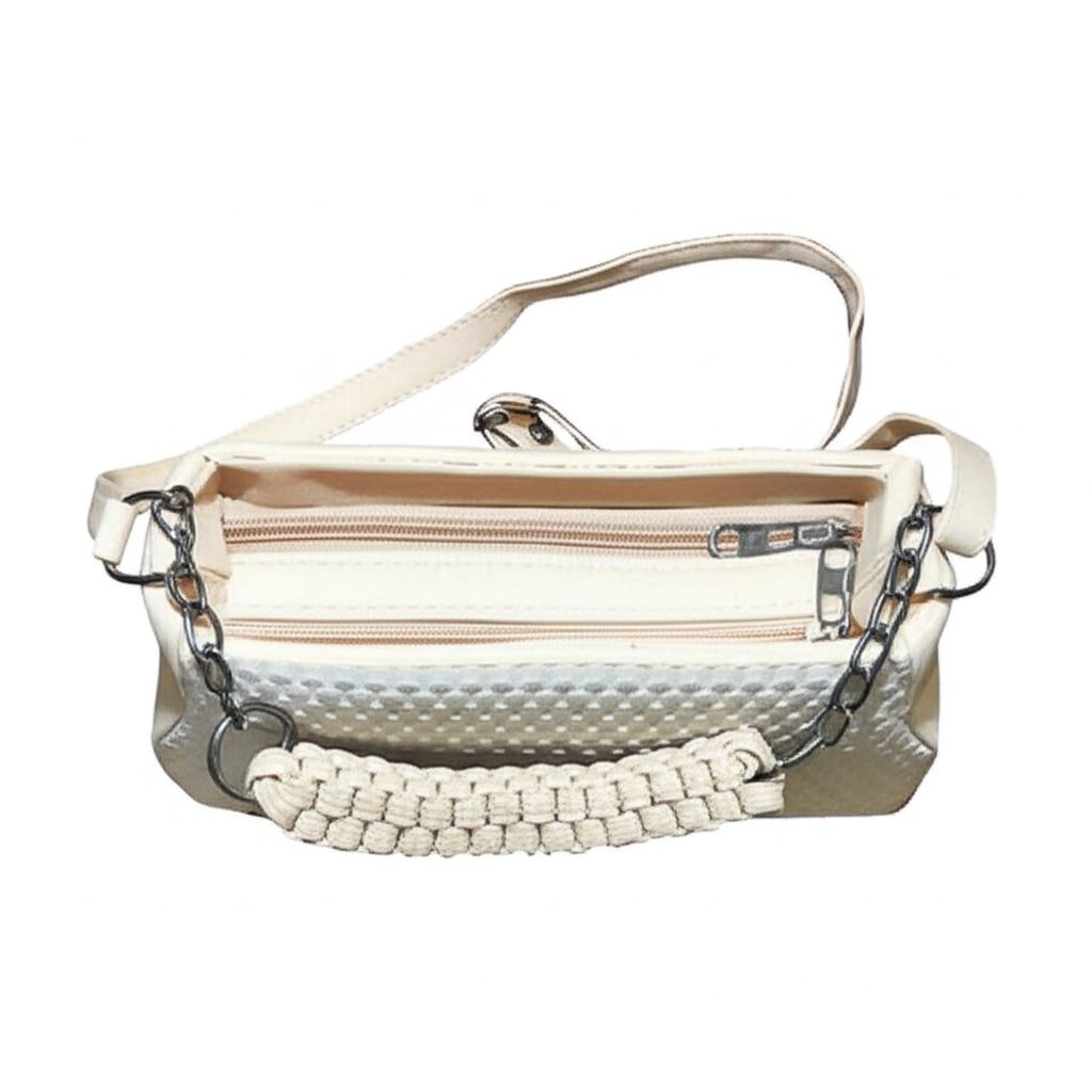 Elevate your everyday style with this chic white woven leather shoulder bag, blending texture, elegance, and comfort. The bag features a premium faux leather body with an intricate woven pattern, paired with a bold black metal chain strap for a modern edge. The centerpiece is a beige braided top handle that adds a touch of artisanal craftsmanship.